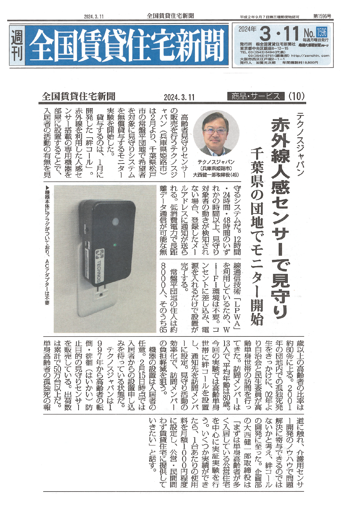全国賃貸住宅新聞2024年3月11日号にて、見守りシステム「絆コール」が紹介されました。