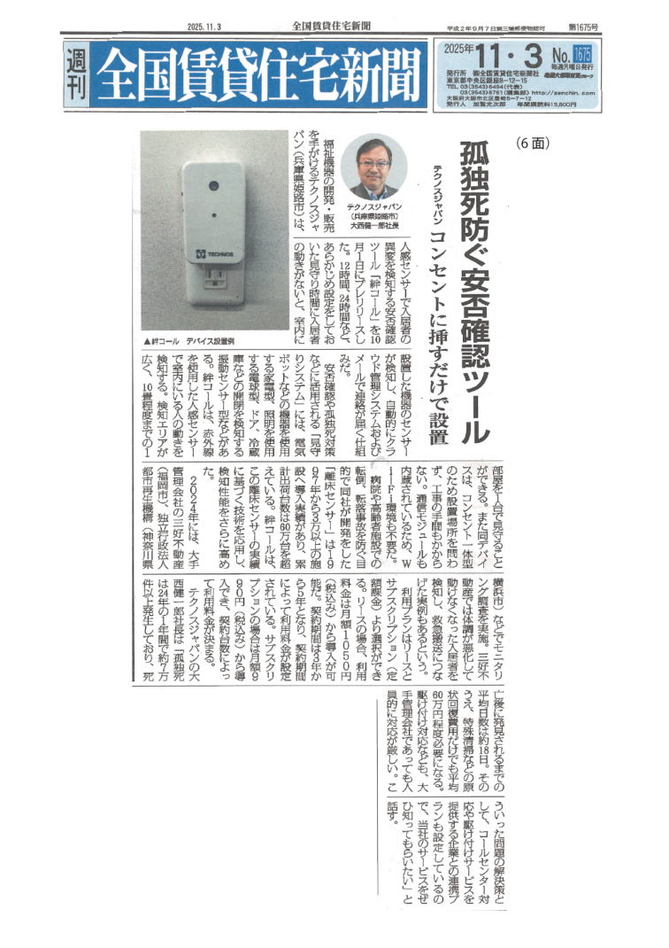 全国賃貸住宅新聞2025年11月3日号にて、 新製品「絆コール」が紹介されました。 製品に関するお問合せは、お客様相談室0120-230-580までお願いいたします。